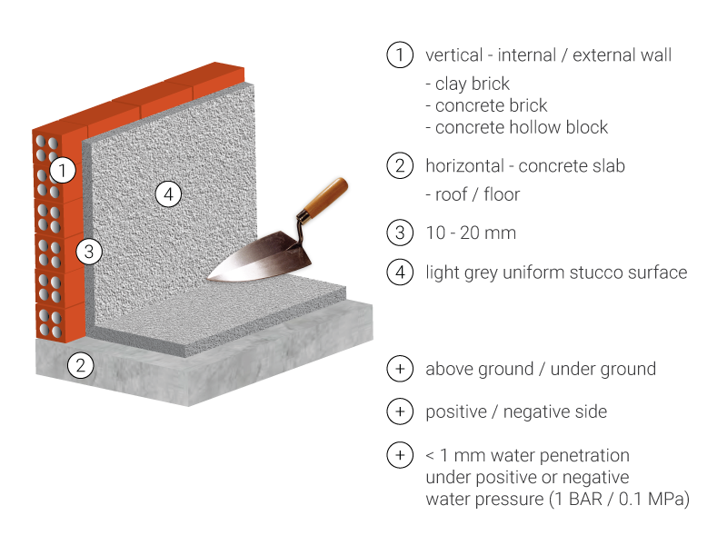 100% waterproof breathable drying grey plastering mortar for concrete surface resistant to water penetration under positive or negative water pressure (1 BAR / 0.1 MPa)